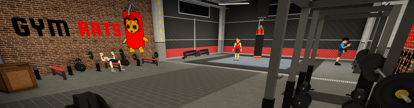 The Gym Rats building is a small, rectangular shaped room. There are people lifting weights along the sides. Near the back wall, there is a large square mat, where a punching bag hangs from the ceiling.
