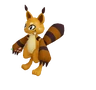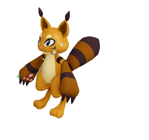 Kleptyke looks like a bipedal raccoon. It has round ears that have a tuft of fur near the tips. It has oval eyebrows, and round eyes under them. Kleptyke also has a striped tail and two striped arms, with pink paw pads.