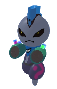 Territi is a small, humanoid Loomian with a gray body and black pants. It has two arms that can spray paint and a mohawk on its head made up of various paint canisters of different sizes.