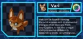 Vari is a small, quadrupedal, fawn-like creature with two short tails and large grey eyes. Vari's male form has small orange horns on its head, but the female does not. Vari's entire body is orange-brown with white and tan accents. While Vari's design is based off a fawn, it also holds many fox-like traits.